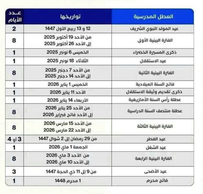في مايلي جدول أيام العطل المدرسية 2025/2026 برسم الموسم الدراسي الجديد: